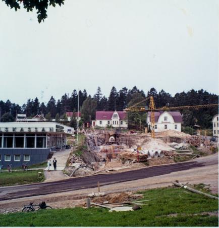 Grunden till sparbankshuset i Finnsbacka by invid Kyrkslätts kyrka under byggnad.