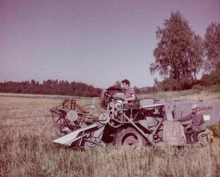 Husbonden Ernst Scheiber och 78 år gamla fogden Anders konstaterar att Sampo skördetröskan fungerar bra.