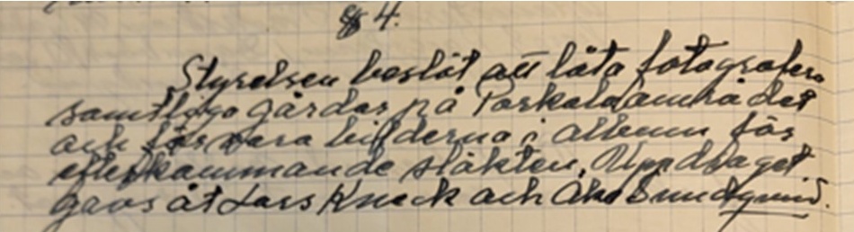 §4 Styrelsen beslöt att låta fotografera samtliga gårdar på Porkalaområdet och förvara bilderna i album för efterkommande släkter. Uppdraget gavs åt Lars Kneck och Åke Sundqvist. |